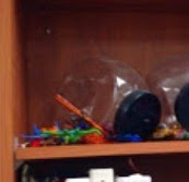 Turns out, I didn't have to. His special ed teacher happened to walk into the room, she took one look at Jack, walked over to me, and before she opened her mouth, I said "this is way to much for him.". She agreed, and asked Jack if he would like to have a chance to read his book to just us. At first, Jack protested, he said he would have nothing to eat (or, if you want to know his real, scripted answer, he said, "but I'll have no food, no water, no communication"), but then she asked if he would like to fly into the other classroom and he was game. If you look below, you will see that Jack's teacher has a shelf of vehicles with propellers, all there for one very special Jack, as rewards.